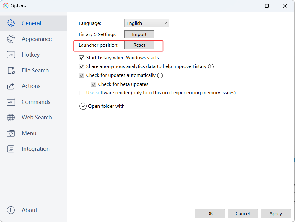May I confirm if you are using multiple monitors? The Listary Launcher window remembers the last screen position where you placed it (for example, on an external monitor), which may cause it to appear off-screen now.
