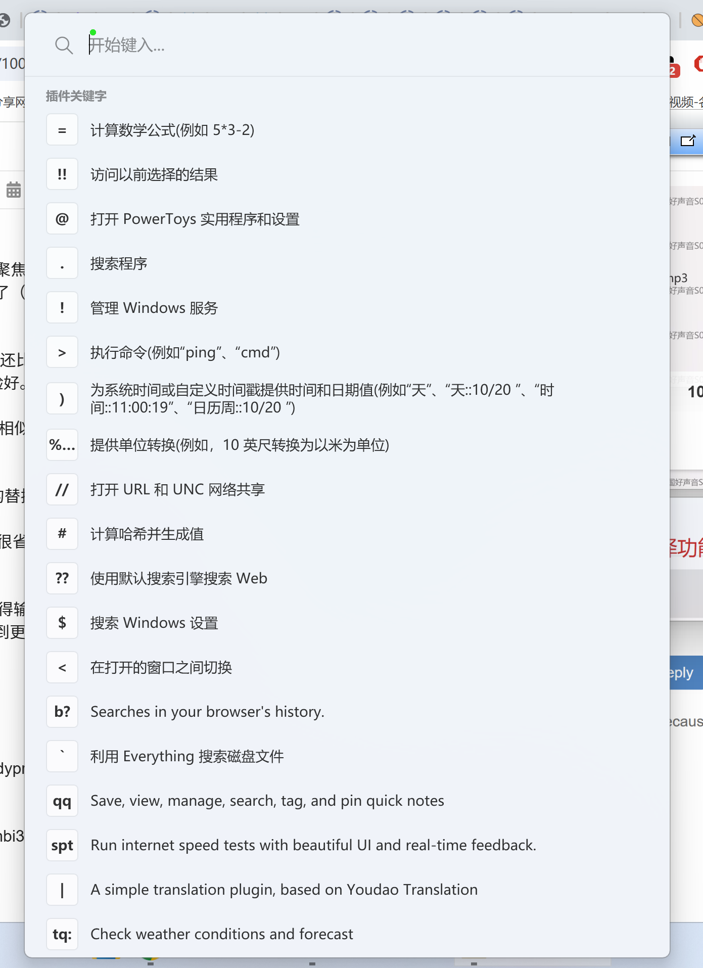 因为PowerToys 每个插件都可以通过一个关键词激活“独享显示”,如果想和listary一样,直接输出搜索关键词就显示结果,也是支持全局关键词激活的。