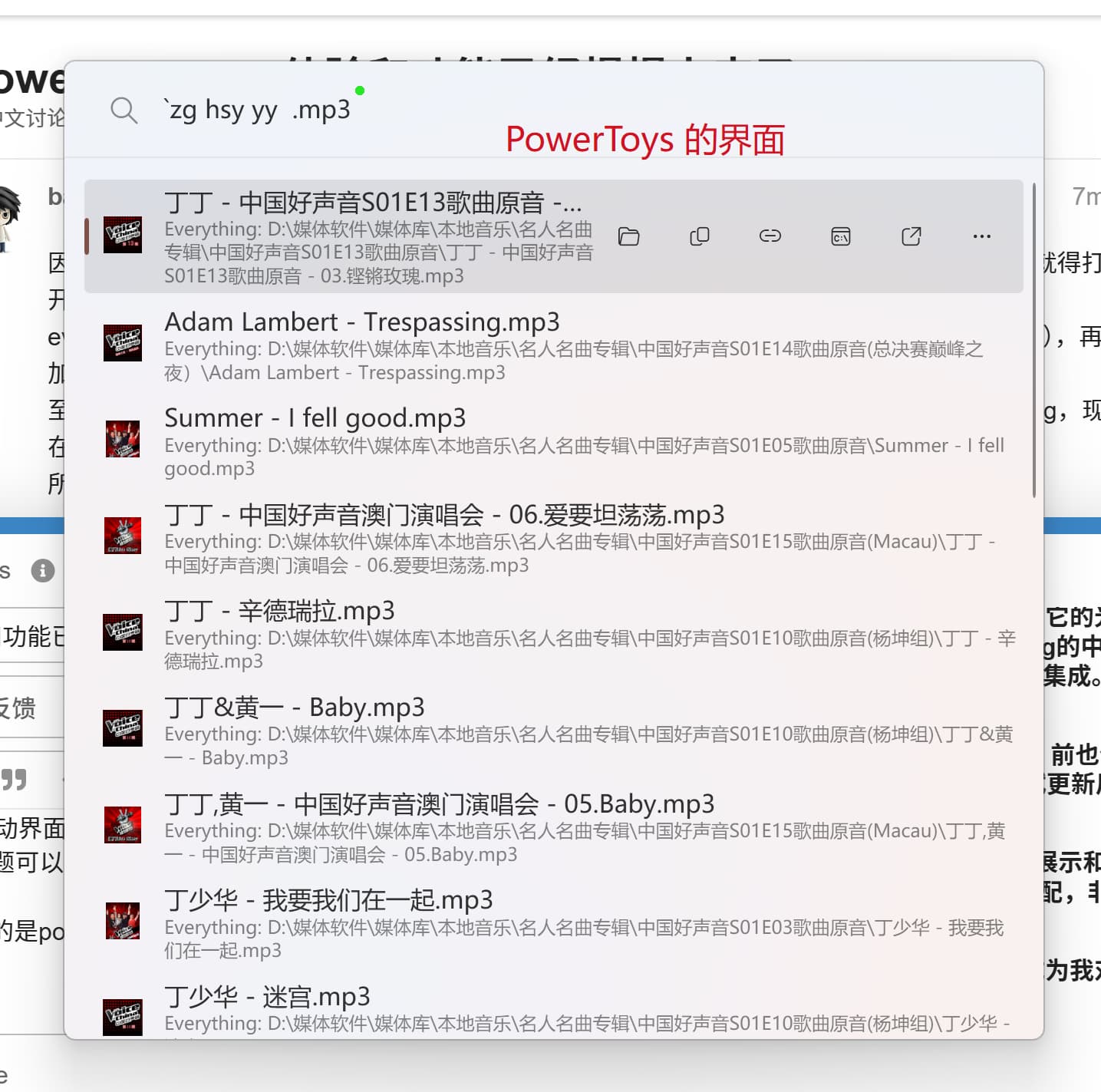 二、一直后台常驻powertoys,主要用它的光标查找聚焦功能,是近发现对everthing集成的很好,而且1.5的everything的中文模糊搜索插件也更新了(原来只支持到1.4),再加上有一些翻译等小插件集成。所以大大提升了体验。